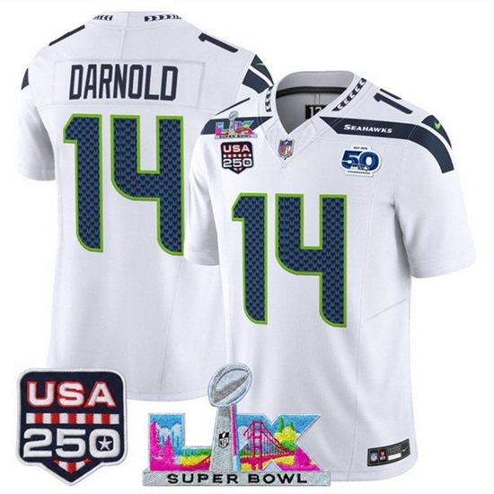 Home>NFL>2025 2026 Super Bowl LX>Seattle Seahawks>Men Seattle Seahawks 14 Sam Darnold White 2025 F U S E Super Bowl LX Patch And 50th Season USA 250 Patch Vapor Limited Football Stitched Jersey