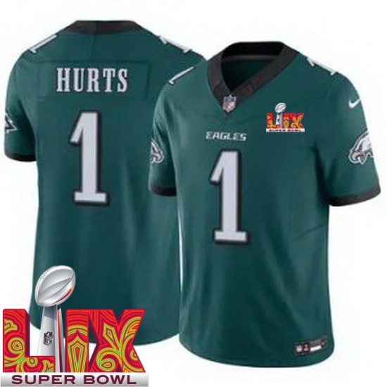 Home>NFL>2024 2025 Super Bowl LIX>Philadelphia Eagles>Men Philadelphia Eagles Jalen Hurts #1 Green 2024 2025 Super Bowl LIX F U S E Stitched NFL Jersey