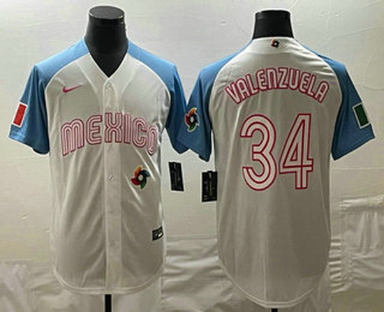 - Mens Mexico Baseball #34 Fernando Valenzuela 2023 White Blue World Classic Stitched Jersey