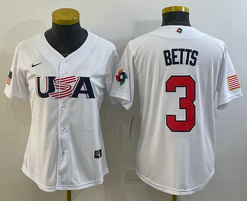 - Women's USA Baseball #3 Mookie Betts 2023 White World Classic Replica Stitched Jersey